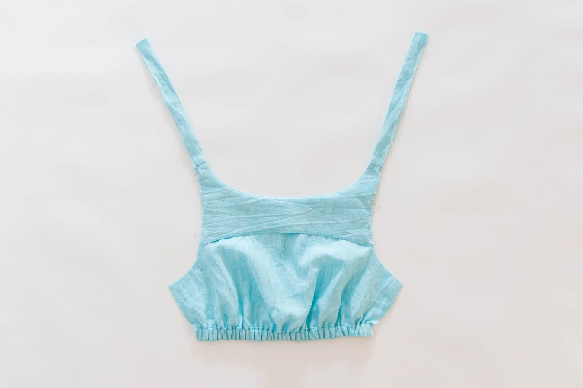 Pull the strap elastic through strap casing. Remove safety pin and stitch securely in place. Repeat for other side.