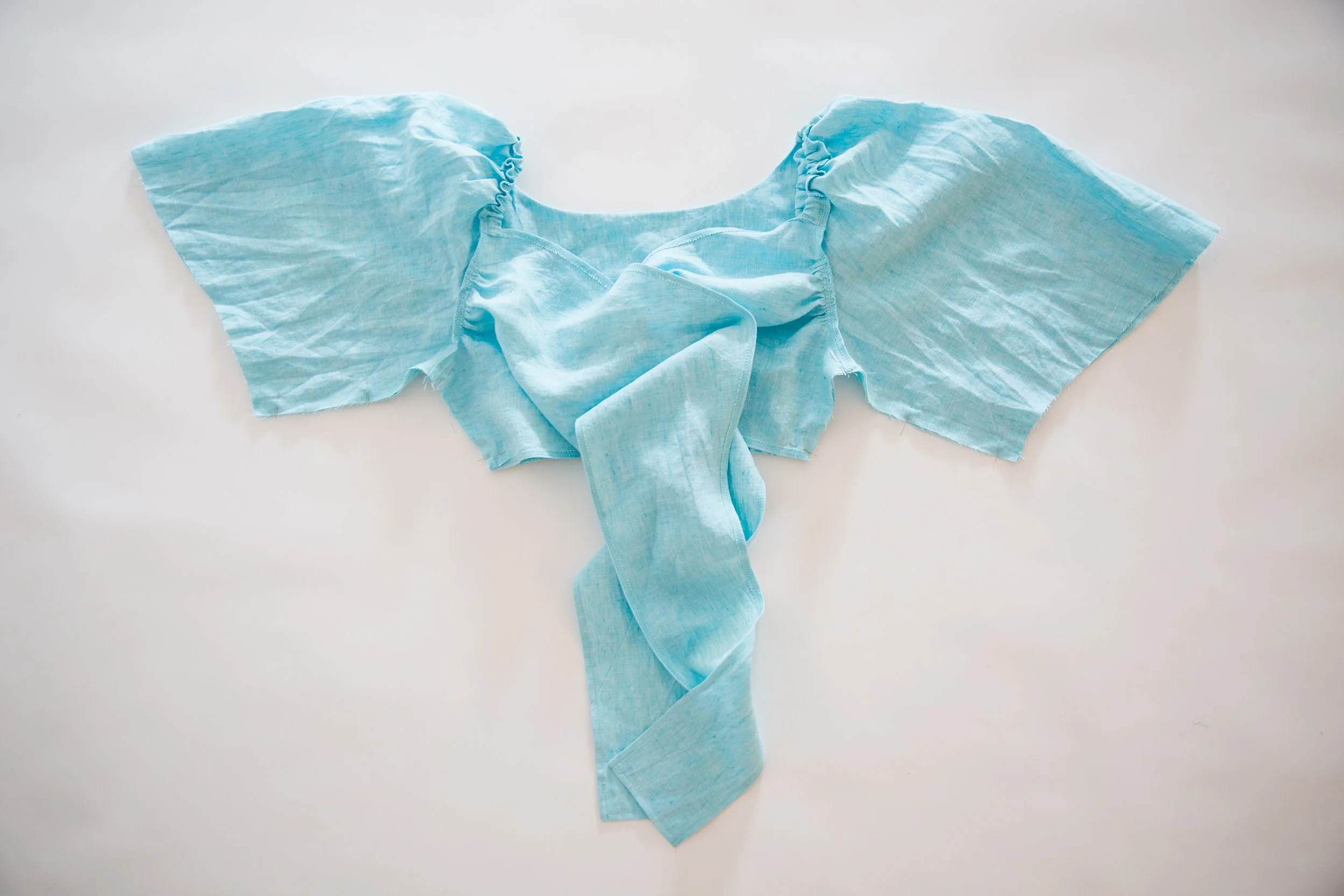 With right sides facing, pin your wrap bodice pieces in to place, matching up underarm and side seams. The hem of wrap pieces should meet bottom edge of waist casing. Stitch together. Neaten seams. Skip straight to sleeve casing step.