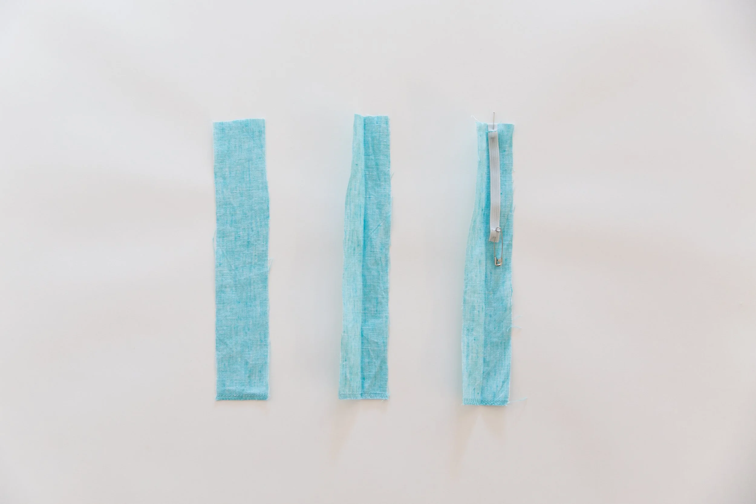 Press top edge, short end and bottom edge of wrap piece in toward the wrong side 1cm/0.39”. Top stitch in place. Repeat for other side.