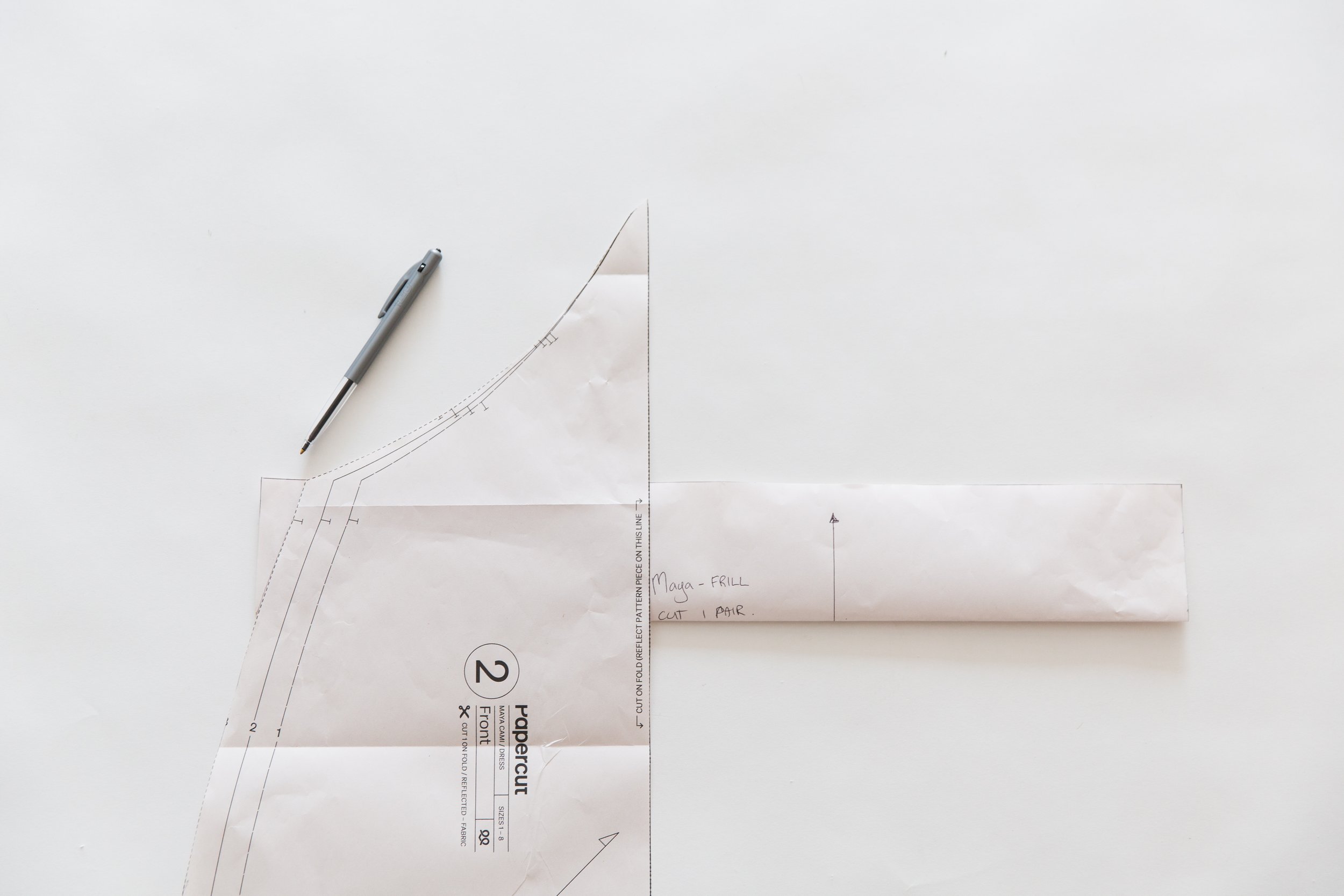 Cut out your new pattern piece. Draw in a straight grainline parallel to the short end. Label your piece ‘Maya Frill’ and cutting instructions ‘Cut 1 Pair’.